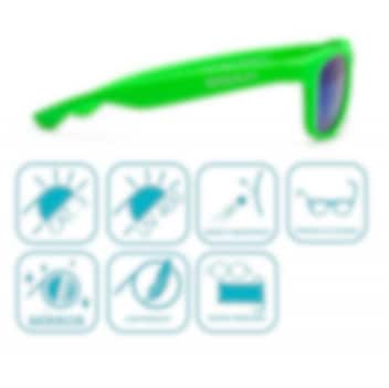 Koolsun Wave Neon Green stiilsed, vastupidavad ja kaitsvad laste päikeseprillid 1 kuni 10-aastastele lastele. Päikeseprillid on valmistatud kvaliteetsest TPE-plastikust ning nende polükarbonaat-klaasidesse on sisse ehitatud UVA ja UVB - kiirguskaitse, mis vastab optilise kategooria 1 ja 3 UV-kiirguskaitse nõuetele. Seetõttu ei kaota prillid oma kaitset ka juhul, kui klaasid saavad kasutuses kriimustada. Stiilseid Wave Fashion päikeseprille sobib kasutada nii suvel, kevadel kui talvel. Komplektis on kaasas ka praktiline mikrofiibrist kotike, mis aitab hoida prille kriimude ja mustuse eest.