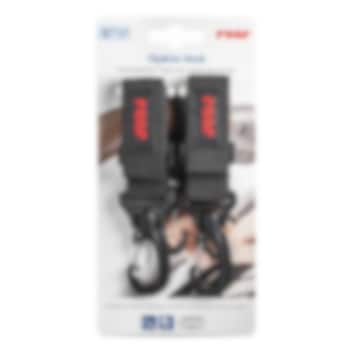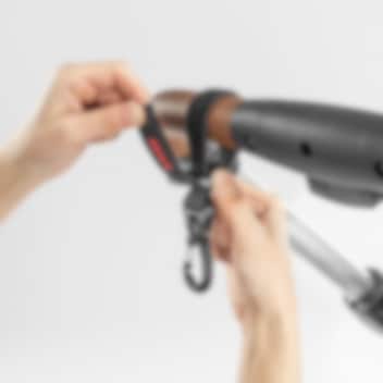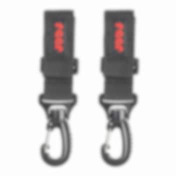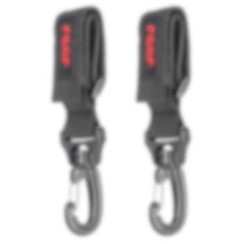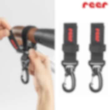 Reer Clip & Go Buggy Hooks - nutikad, takjapaelkinnitusega paigaldatavad tugevad karabiinkonksud lapsevankri või jalutuskäru käepidemele. Suurepärane lisatarvikute ja ostukottide riputamiseks. Pakendis on kaks konksu käepideme kummalegi poolele, mis võimaldab vältida kottide nn. jalgade vastu põrkumast ja tagab parema tasakaalu, et käru ümber ei kukuks.