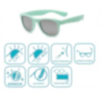 Koolsun Wave Bleached Aqua stiilsed, vastupidavad ja kaitsvad laste päikeseprillid 1 kuni 10-aastastele lastele. Päikeseprillid on valmistatud kvaliteetsest TPE-plastikust ning nende polükarbonaat-klaasidesse on sisse ehitatud UVA ja UVB - kiirguskaitse, mis vastab optilise kategooria 1 ja 3 UV-kiirguskaitse nõuetele. Seetõttu ei kaota prillid oma kaitset ka juhul, kui klaasid saavad kasutuses kriimustada. Stiilseid Wave Fashion päikeseprille sobib kasutada nii suvel, kevadel kui talvel. Komplektis on kaasas ka praktiline mikrofiibrist kotike, mis aitab hoida prille kriimude ja mustuse eest.