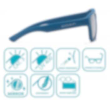 Koolsun Aspen Deep Water stiilsed, väga vastupidavad ja kaitsvad laste päikeseprillid 1 kuni 12-aastastele lastele. Moodsa lõikega päikeseprillid on valmistatud kvaliteetsest TPE-plastikust ning nende polükarbonaat-klaasidesse on sisse ehitatud UVA ja UVB- kiirguskaitse, mis vastab UV-400 standardi optilise kategooria 3 UV-kiirguskaitse nõuetele. Seetõttu ei kaota prillid oma UV-kaitset ka juhul, kui klaasid saavad kasutuses kriimustada. Prilliraamide ja klaaside kvaliteet teeb neist pea purunematud ka juhul, kui laps peaks neile peale istuma. Stiilseid Aspen päikeseprille sobib kasutada nii suvel, kevadel kui talvel. Komplektiga on kaasas praktiline mikrofiibrist hoiukotike, mis aitab hoida prille kriimude ja mustuse eest.