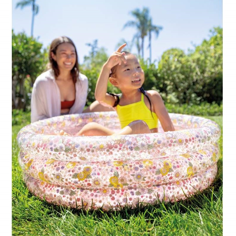 Intex Sweet Blossom - lilledega, kolme rõngaga, pehmete äärte- ja põhjaga täispuhutav ja kaasaskantav lastebassein, mille saab hõlpsasti reisikotti kaasa pakkida. Kokkupandult võtab bassein sedavõrd vähe ruumi , et on ideaalne mänguvahend puhkusereisile või suvilasse kaasa võtta ning suvel randa minna. Lastebasseinis on mänguruumi kuni kahele beebile või mudilasele.