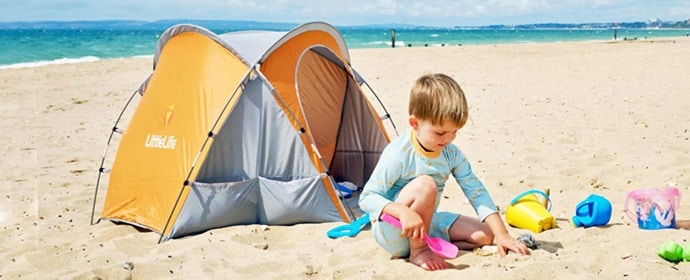 2. Päikesekaitse: Pikema päikese käes viibimise korral kasuta lisaks kvaliteetset, lastele mõeldud UPF 50+ kaitsega päikesekreemi. Püstita rannalina kõrvale pop-up rannatelk, milles laps võib mängida, puhata või lõunauinakut teha. Rannatelgid on enamasti hästi ventileeritud või eest avatud kerged telgid, mida on lihtne avada ja kokku panna ning kaasa võtta. Telgis saab laps saab puhata kuumusest ja päikesest. Lapse silmi ereda liivalt ja veelt peegeldava või otsese päikesekiirguse eest kaitsevad kvaliteetsed UV-400 kategooria päikeseprillid. Veendu, et need sobivad lapse näokujuga ning püsivad ka päriselt peas.