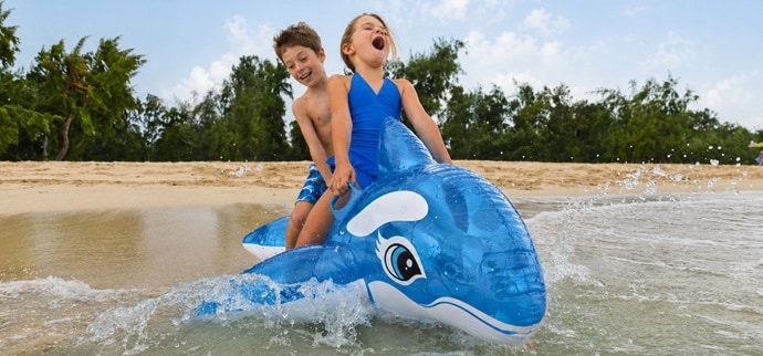 Lisaks liivamänguasjadele muudab nii beebi kui mudilase mängurõõmu suuremaks võimalus vees hullata. Püsige rannalähedasel veealal, et vältida ujumisrõngas, täispuhutaval ujumisloomal või ujumismadratsil kaugele merele triivimist. Täispuhutavad kätised ja ujumisvest aitavad lapsel tõhusalt veepinnal püsida ja ujumisasendit õppida. Täispuhutavad minibasseinid sobivad hästi beebile või väikesele mudilasele liival sulistamiseks ja mängimiseks. Veeskuutrid, täispuhutavad SUP-lauad, XL suuruses ujumisrõngad ja veemängud nagu korvpall, veepall või sukeldumispulgad, sobivad hästi pisut suurematele lastele vees hullamiseks. Rannaponchos on mõnus last pärast suplust kuivatada ja soojendada. Veendu, et hoiad lapsel vees olles pidevalt silma peal!