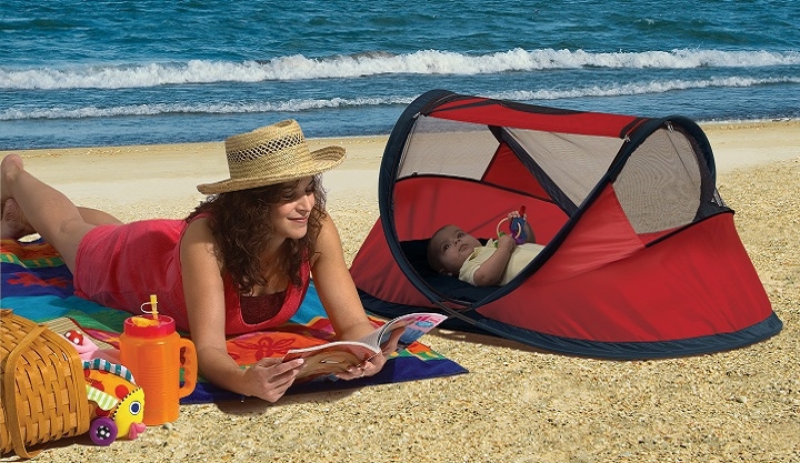 Hollandi firma Deryan UV rannatelk on valmistatud pop-up tehnoloogia põhimõttel, mis tähendab,et telgi saab püstitada ühe hetkega pärast transpordikotist välja võtmist. Telk on valmistatud päikesekaitsefaktoriga SPF 50+ kangast (riidest osadel) ning varustatud suurte võrkkangast ventilatsiooniavadega nii külgedel kui lukuga avataval ja suletaval esiküljel. Selle rannatelgi eeliseks on suletavus, igast suunast ümbritsev võrkkangas kaitseb putukate eest ning võimaldab hea õhuliikuvuse samal ajal kui kaitseb last päikese eest. Vastupidavad klaasfiibrist telgikaared on integreeritud ning komplektis on kaasas ka telgivaiad, millede abil saab rannatelgi tugevamini maa peale kinnitada. Telk kaalub vaid 1 kg, on kasutuses 120 x 70 x 80 cm ning kokkupandult 55 (diameeter) x 5 cm. Pop-up rannatelgi õiget kokkupanemist peale kasutust on mõttekas enne kasutuselevõttu kodus video abil veidi harjutada.