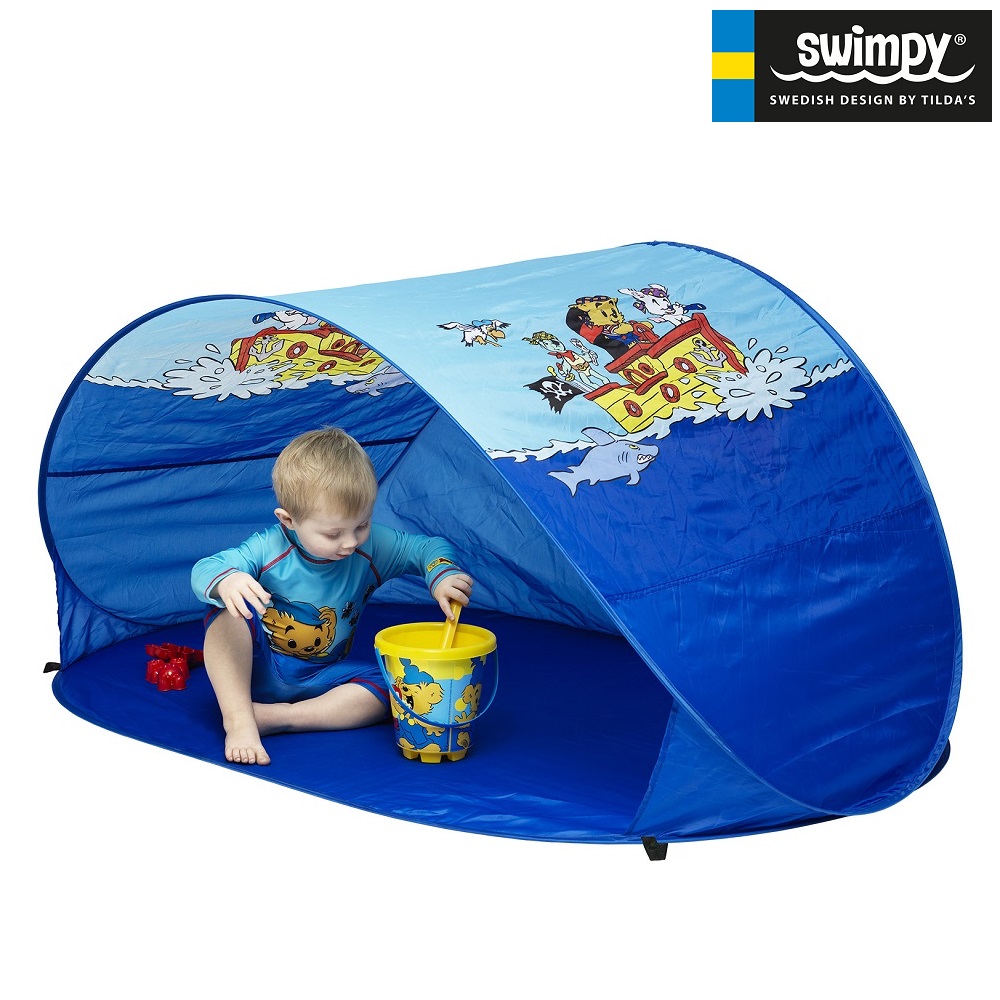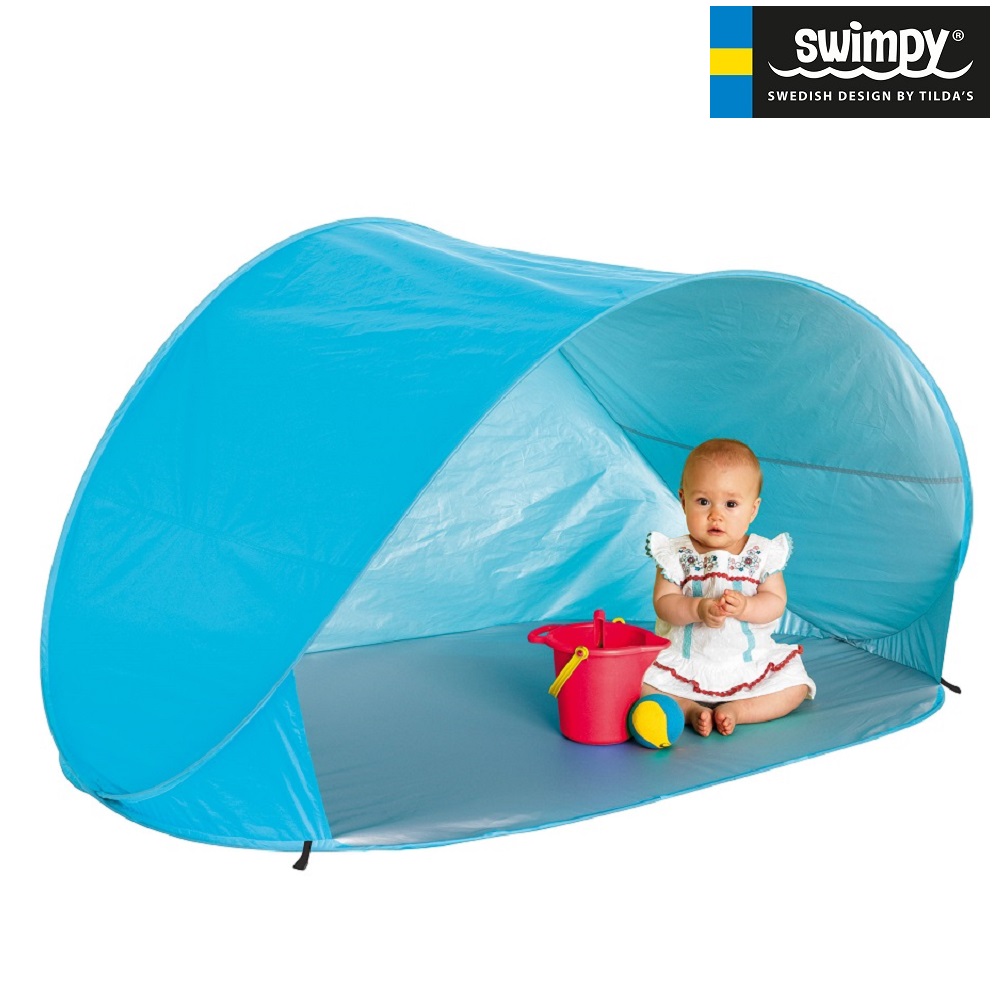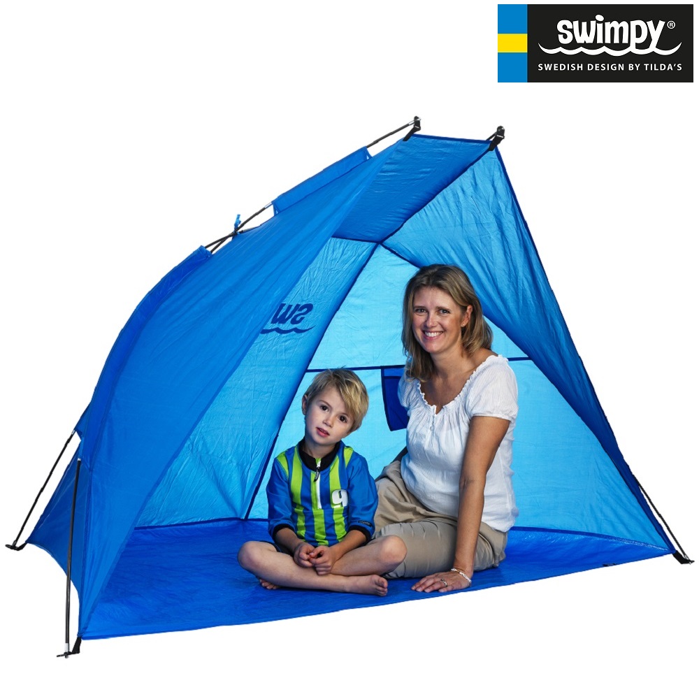 Swimpy on Rootsi kaubamärk, mis valmistab nii laste uv-kaitseg ujumisriideid, ujumisvarustust kui rannatelke. Nii Swimpy sinine kui Bamse motiiviga rannatelk (sama telk erineva disainiga) on kasutuses ruumikad - 150 x 100 x 75 cm, ülikerged (0,5 kg) ning valmistatud päiksekaitsefaktoriga SPF 50+ materjalist. Mõlemad Swimpy rannatelgid töötavad pop-up põhimõttel , on integreeritud klaasfiiberkaartega ning komplektis on kaasas praktiline sangadega transpordikott mõõtudega 64 (diameeter) x 2 cm. Lisavarustusena saab osta komplekti metallist telgivaiasid, mis on mõistlik valik pidades silmas tuulisemaid päevi. Selle telgimudeli vaieldamatu eelis on kergus ja lihtne lahtivõtmine ja kokkupanemine. Rannatelgi esikülg on avatud.